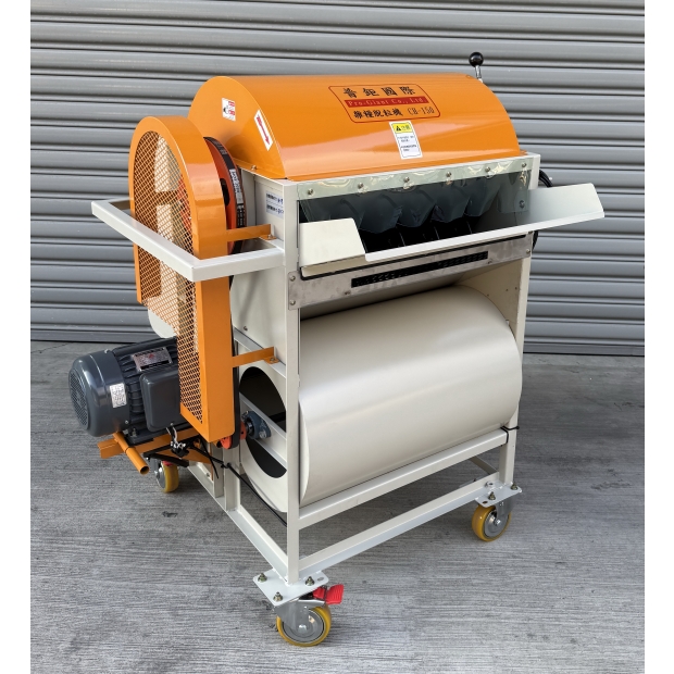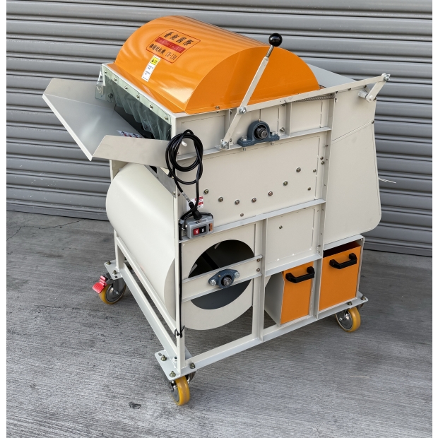 - 採用滾筒脫粒桶脫粒,下方有2個原料排出口,排出方式有兩種讓客戶選擇:1.斜料斗式直接排出 2. 抽屜式料斗,脫粒後拉出抽屜倒出原料,適合採樣原料檢驗用。