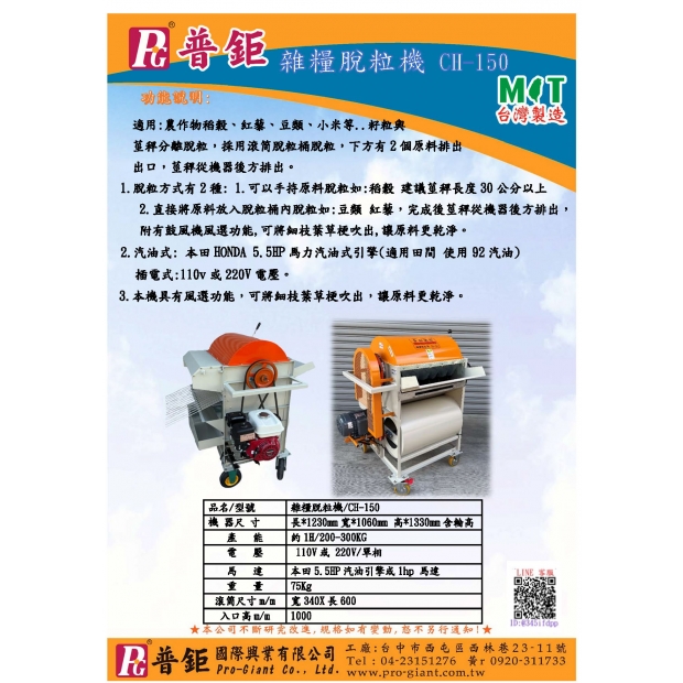 - CH150 汽油式: 本田HONDA 5.5HP馬力 汽油式引擎 (適用田間 使用92汽油) 插電式:110v電壓