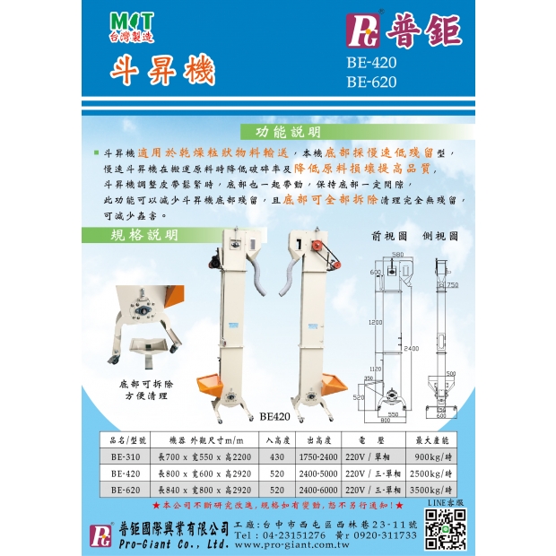 - 斗昇機適用於乾燥粒狀物料輸送,本機底部採慢速低殘留型,慢速斗昇機在搬運原料時降低破碎率及降低原料損壞提高品質,斗昇機調整皮帶鬆緊時,底部也一起帶動,保持底部一定間隙,此功能可以減少斗昇機底部殘留,且底部可全部拆除清理完全無殘留,可減少蟲害•