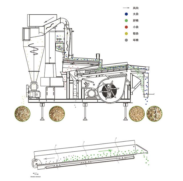 風篩粗選機多功能設備立式風篩機、比重篩選機組成.根據物料和雜質的比重差異.從斗昇機進入旋風桶,被均勻分散進入立式風篩,物料在風力的作用下吹出輕雜質,接著物料流入比重台,依物料和雜質的比重差異比重較小的雜質.壞料:在表層向低處流動壞料口排出,好料:在底層向高處流動,從好料口排出。